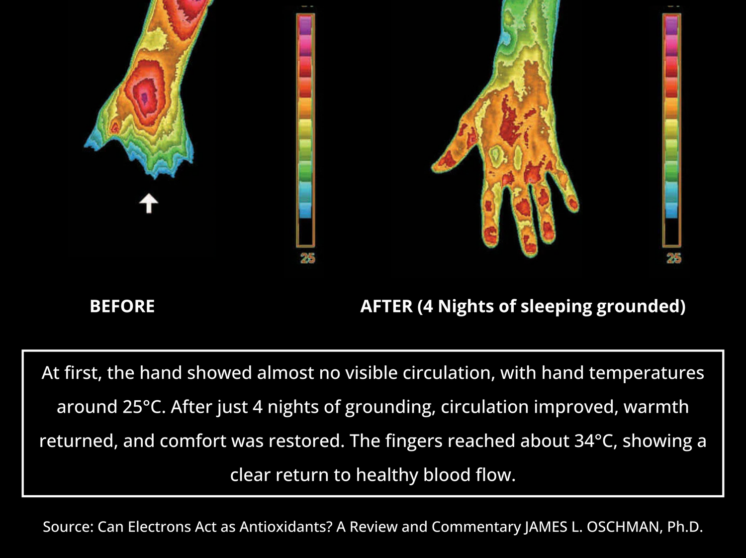 Before grounding: Circulation is poor and uneven, leading to inflammation, swelling, and discomfort.